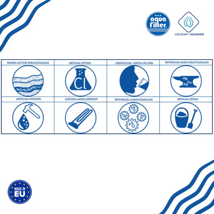 AQUAFILTER -ის პროდუქციის ხარისხაის საზომი არის ის რომ დღეს დღეობით იყიდება მსოფლიოს 90 მეტ ქვეყანაში და აგრეთვე სერტიფიცირებულია NSF და WRAS-ის მიერ. აკმაყოფილებს ყველა საჭირო სტანდარტს და მოთხოვნებს ISO და TUV.
